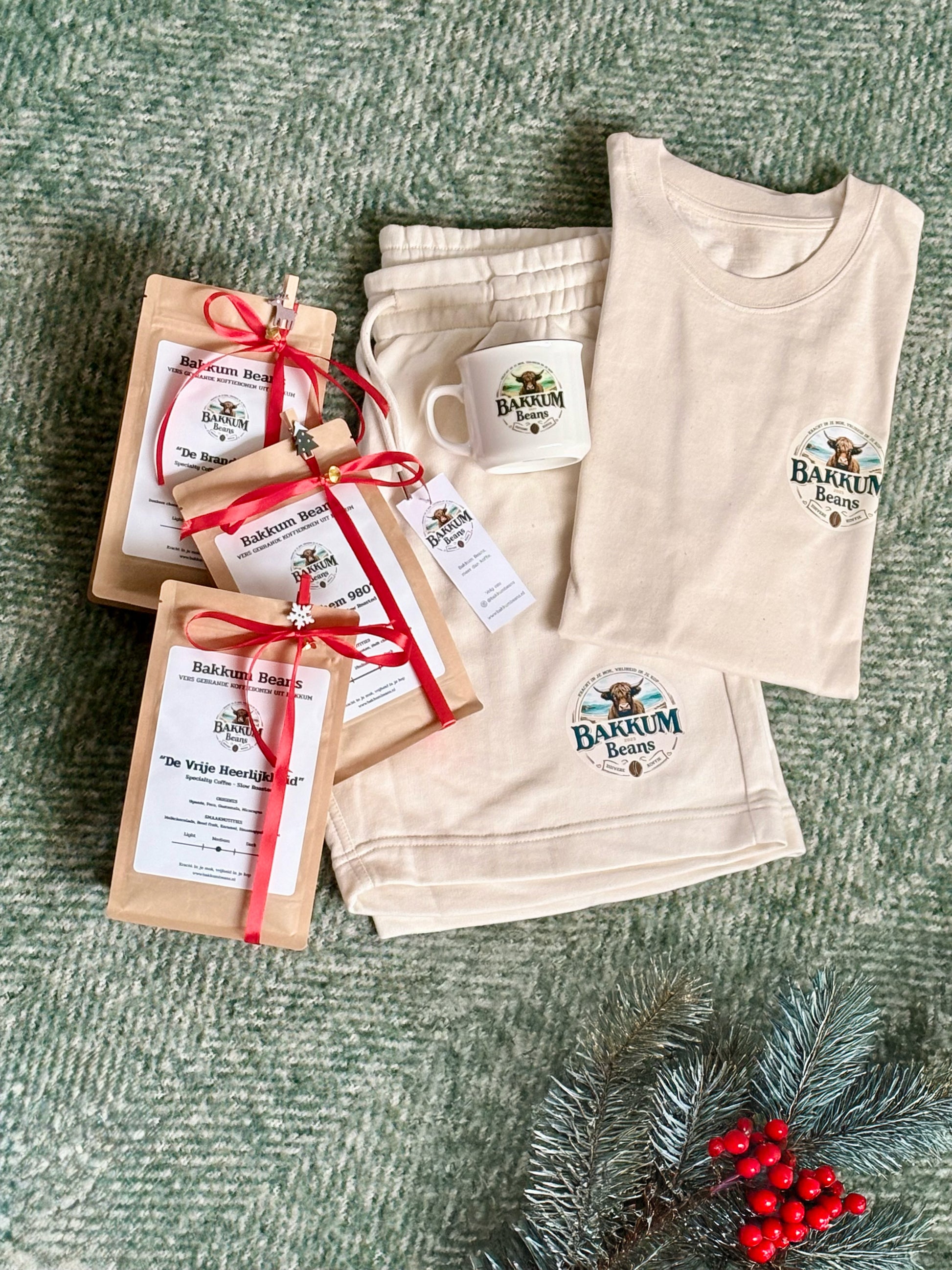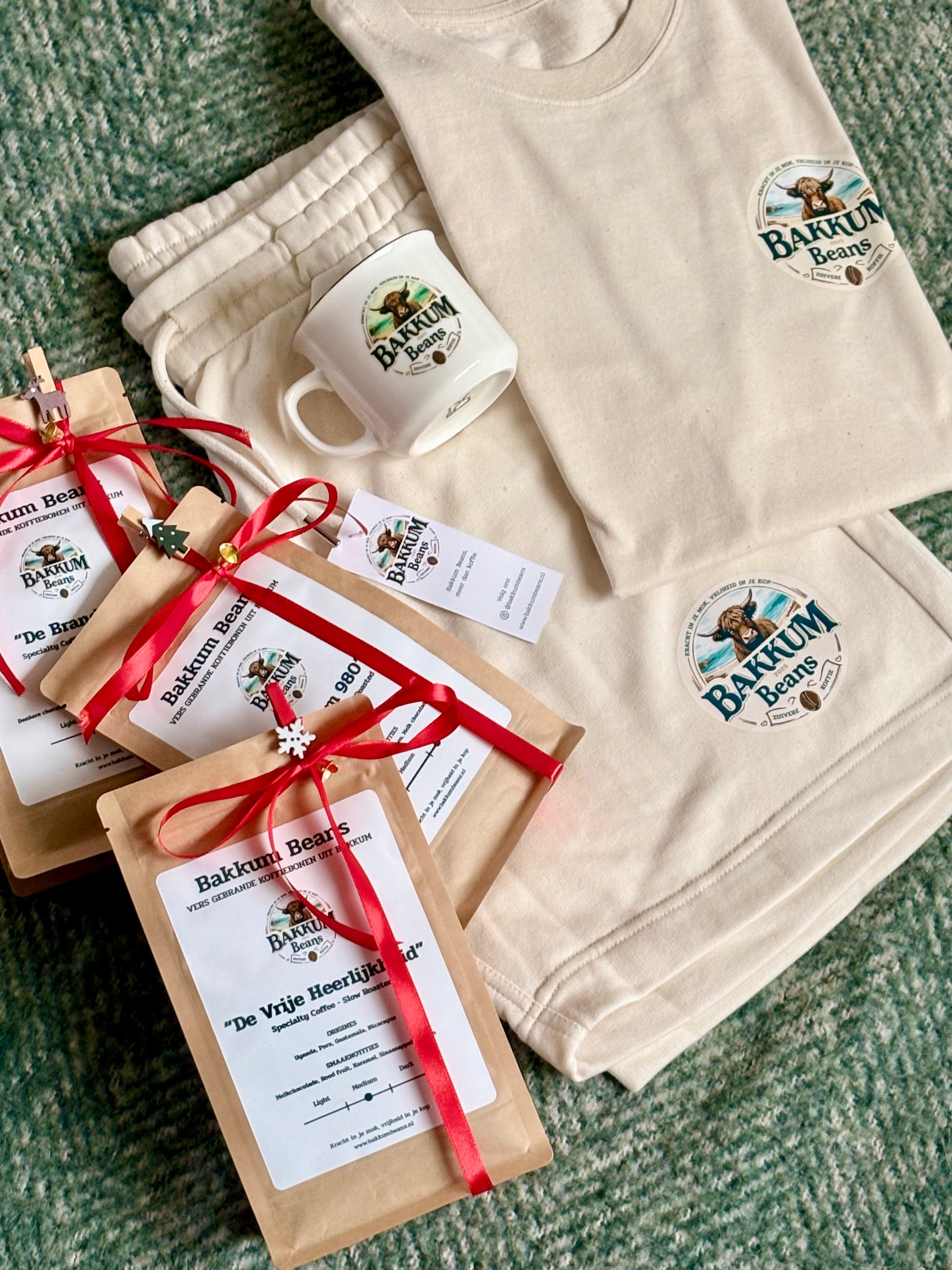 Samen met de Vintage Bakkum Beans Mok, het oversized T-shirt van biologisch katoen en de comfortabele shorts vormt dit pakket de essentie van Bakkum Beans: eerlijke kwaliteit, ontspannen stijl en liefde voor het koffiemoment.